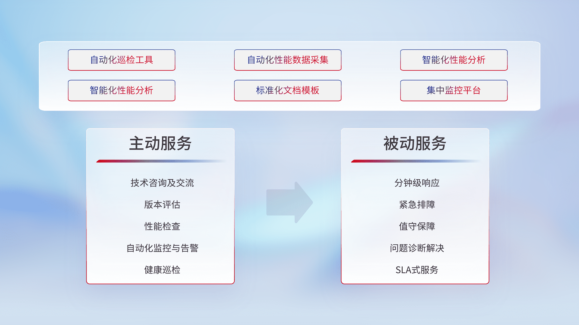 智能化工具和标准化文档,,,,保障服务质量,,,,提供主动服务(包含技术咨询、、、、版本评估、、、、性能检查、、、、自动化监控与告警、、、、健康巡检)和被动服务包含(分钟级响应、、紧急排障、、、值守保障、、问题诊断解决、、、SLA服务)。。。。
